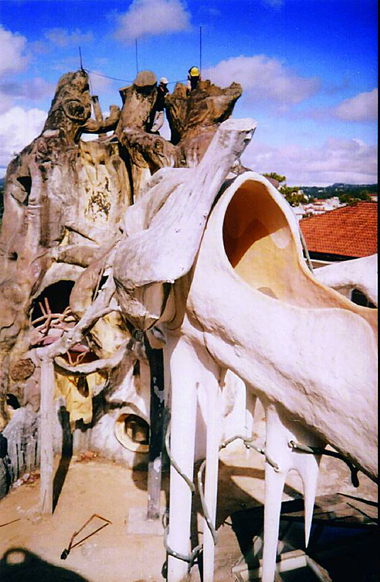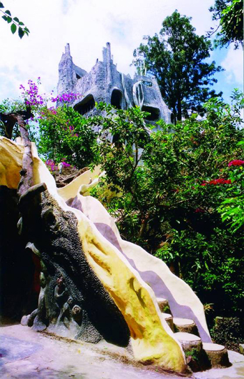 Biệt Thự Hằng Nga ở Đà Lạt. Ảnh Internet Được xây dựng từ năm 1990 trên khuôn viên rộng gần 1.900m2 ở số 3 đường Huỳnh Thúc Kháng, công trình này ban đầu có tên là biệt thự Hằng Nga, sau đổi thành “Crazy house” hay “Ngôi nhà kỳ dị”. Nói “ngôi nhà” là chưa thật chính xác, vì đây là một quần thể kiến trúc lạ mắt. Với lối kiến trúc phá cách theo trường phái biểu hiện, tòa lâu đài trông tựa như những gốc cây hoặc một phần cơ thể của những con thú hoang dã ẩn hiện trong rừng già. Những ô cửa sổ lồi lõm hình thù kỳ lạ, xếp đặt có vẻ thiếu “ngăn nắp” nhưng nhìn kỹ thì như những con mắt của thú rừng. Du khách có thể ngắm nhìn khu vườn trong biệt thự với một tấm mạng nhện khổng lồ bằng sắt ở ngay lối vào.