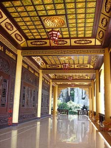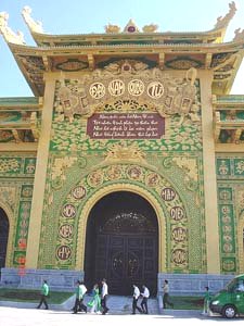 Bên trong "Đại Nam Quốc Tự" là một thế giới đầy màu sắc chói lọi. Đặc tính kiến trúc ở đây là một sự kết hợp lạ mắt giữa kiểu cách chạm trổ cung đình và đường nét hoa văn tự viện. Nhìn tổng thể, sự cấu trúc công phu, tốn kém nhưng thiếu tinh xảo. Một người làm thơ có thể làm ra vạn bài thơ nhưng không phải là thi sĩ vì thiếu hồn thơ. Một tác giả có thể in nhiều sách chất cao quá đầu, nhưng chưa hẳn đã có được một tác phẩm hay vì thiếu mất tài hoa tinh tuý. Một tự viện đồ sộ nhưng không là chốn thiền môn vì chân tâm bị khuất lấp nên Phật tánh khó tỏ bày. Tiền đường của "Đại Nam Quốc Tự" thờ ba tượng đồng kích thước bằng nhau. Xếp thứ tự từ trước đến sau: Tầng thứ nhất là tượng cụ Hồ Chí Minh. Tầng thứ hai là tượng đức quốc tổ Hùng Vương. Tầng thứ ba là tượng đức Phật. Hai bên tượng đức Phật có ghi hai câu thơ lục bát của cụ Nguyễn Du, chữ sắp theo hàng dọc và xếp từ trái sang phải theo hình thức câu đối. Hai hàng chữ lớn đó đập ngay vào mắt khách. Nguyên tác tuyệt vời của Tố Như: Thiện căn ở tại lòng ta, Người đọc bỗng chạnh lòng thương Nguyễn Du. Thơ của thi hào dân tộc bị vặt lông, "trùng tu", bởi một nhân vật nào đó chẳng những đã không hiểu tư tưởng Nguyễn Du lại còn "ngoại đạo" với triết lý Phật giáo. Cái Thiện Căn - là chân tánh; là bản lai diện mục như như tự tại - trong triết lý trái tim của nhà Phật bị cột buộc vào phàm tướng Hoạ Phúc... là một nghịch lý dung tục khó tưởng tượng lại nghiễm nhiên xuất hiện tại "Đại Nam Quốc Tự"!