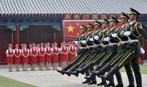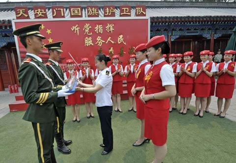 Cuối tháng 6, 18 nữ tiếp viên xinh đẹp của tuyến Bắc Kinh - Thiên Tân tập trung tại Quảng trưởng Thiên An Môn rèn luyện dưới sự hướng dẫn của các chiến sĩ cầm cờ. Ảnh: Xinhua Họ mong mỏi noi gương, mang theo tinh thần và kỷ luật làm việc của các chiến sĩ vào phục vụ hành khách trên tàu. Ảnh: Xinhua Một chiến sĩ đang biểu diễn nghi thức treo cờ trên Quảng trường Thiên An Môn, trước sự chứng kiến của các nữ tiếp viên xinh đẹp. Ảnh: Xinhua