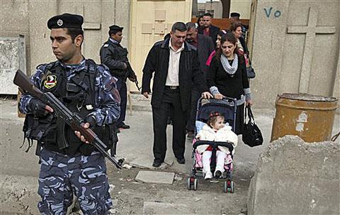 Trong khi đó, lễ lạt trong ngày Giáng Sinh bị hủy bỏ ở khắp Iraq. Với những lời đe dọa của al-Qaeda sẽ mở thêm những vụ tấn công vào cộng đồng Thiên chúa giáo bị bủa vây, năm nay, các nhà lãnh đạo Thiên chúa giáo trong ba khu vực bất ổn trong nước đang hủy bỏ những lễ lạc mừng Giáng sinh. Các chủ chiên trong những thành phố Kirkuk và Mosul ở miền bắc và tại thành phố cảng Basra ở miền nam đã cho hủy bỏ thánh lễ truyền thống vào đêm Giáng sinh và đã yêu cầu các giáo dân không nên trang hoàng cho ngày lễ. (Ảnh: Cảnh sát Iraq bảo vệ lối vào một nhà thờ ở Baghdad, Iraq, ngày 24/12).