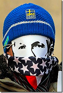 Một người biểu tình ủng hộ Julian Assange đã đeo mặt nạ có hình Assange bị bịt miệng bởi lá cờ Mỹ