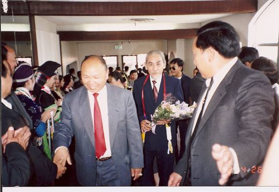 Tướng Vang Pao (cà vạt đỏ) và cộng đồng Lào-Hmong Tự Do đón tiếp tác giả (VĐT - cầm bó  hoa) tại Fresno, California, 1992, theo lễ cổ truyền của Lào và sắc tộc Hmong, sau khi tác giả ra khỏi ngục tù cộng sản Hà Nội.