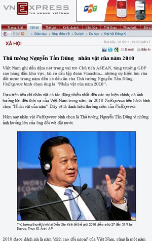 Cùng ngày 12 tháng 1, 2011, báo VnExpress tung ra bài “Báo nước ngoài ca ngợi ‘Nhân Vật của Năm’ - Thủ Tướng Việt Nam,” dài hơn 900 chữ.