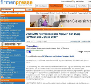Ông Nguyễn Tôn Hiệt liệt kê: Tờ thông cáo báo chí thứ nhất được công ty “RES-Resources, Ecology, Services GmbH” đăng trên firmenpresse.de, có nhan đề “Việt Nam: Thủ Tướng Nguyễn Tấn Dũng là ‘Nhân vật của năm 2010,’ đăng ngày 10 tháng 1, 2011.