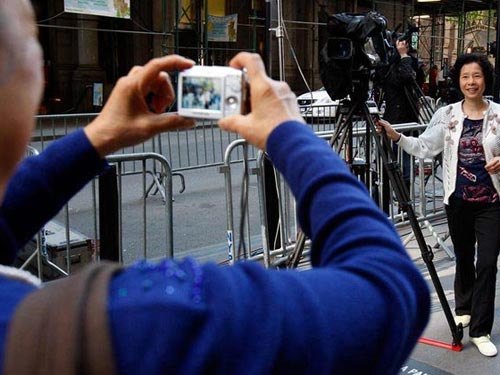 Du khách châu Á chụp ảnh kỷ niệm trước tòa nhà số 71, đại lộ Broadway. Ảnh: REUTERS