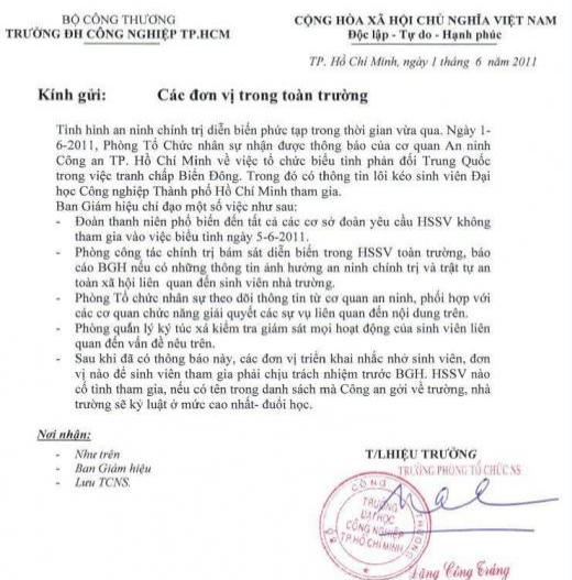 Đại học Công Nghiệp : Thông báo dọa đuổi học sinh viên tham gia biểu tình chống TQ
