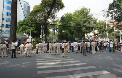 Tàu Cộng: Các cuộc “biểu tình tự phát” trước Tòa Ðại Sứ Trung Quốc ở Hà Nội và Tòa Tổng Lãnh Sự của họ ở Sài Gòn đã diễn ra sáng ngày Chủ Nhật, 5 tháng 6, 2011 (giờ Việt Nam). Dưới đây là tin tức và những hình ảnh về cuộc biểu tình ở Sài Gòn và Hà Nội được các bloger đưa lên các trang mạng xã hội. * Sài Gòn Người biểu tình trước Nhà Văn Hóa Thanh Niên, số 4 Phạm ngọc Thạch, Sài Gòn. (Hình: Trâm Anh Ken) Đoàn biểu tình đứng đối diện Tòa Lãnh Sự Trung Quốc ở Sài Gòn. (Hình: Trâm Anh Ken) Chốt chặn của công an góc Phạm Ngọc Thạch và Nguyễn Thị Minh Khai. (Hình: Trâm Anh Ken)