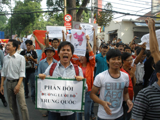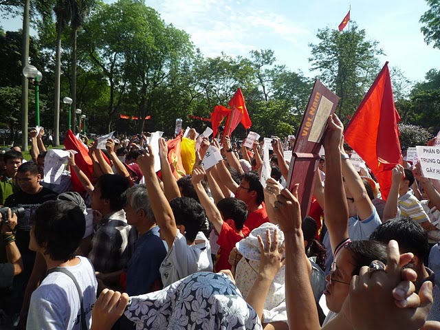 * Lúc 10:00 - Sài Gòn : Đoàn biểu tình tuần hành trên tất cả các tuyến đường dẫn đến Lãnh sự quán TQ, lượng người tiếp tục kéo đến chật kín cả đoạn đường, kéo dài từ Nhà Thờ Đức Bà đến Đại sứ quán Mỹ, và càng lúc càng đông hơn. Theo dự đoán, cuộc biểu tình sẽ kéo dài đến tận chiều nay, thậm chí có thể biểu tình qua đêm - Hà Nội : Đoàn biểu tình tiếp tục tuần hành sang đoạn đường Trần Phú * Lúc 09:30 : - Sài Gòn bùng nổ lớn, không khí biểu tình hiện rất rất sôi nổi. Lực lượng an ninh gần như bất lực trước số lượng áp đảo của đoàn người biểu tình. Tin chưa kiểm chứng cho biết, lực lượng biểu tình đã lên đến hàng ngàn người