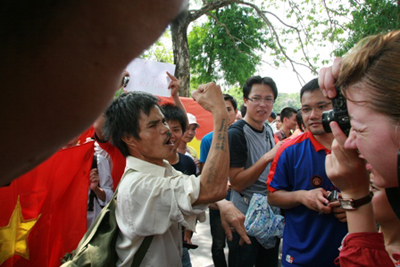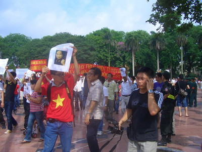 Nhưng vẫn biểu tình Tới 8:25, các nhóm biểu tình đã tập hợp được với nhau, kéo đến đối diện tòa đại sứ. Ước tính có khoảng hơn 500 công an, cảnh sát được huy động, "Công an còn đông hơn người biểu tình," trang Dân Làm Báo cho biết. Tuy nhiên, lần này "Lực lượng an ninh không dùng dây để đẩy đoàn biểu tình ra khỏi công viên như lần trước," TS Nguyễn Xuân Diện viết trên blog. TS Diện cho biết ông thấy có Giáo sư Huệ Chi, Giáo sư Phạm Duy Hiển, Nhà phê bình Phạm Xuân Nguyên... và rất nhiều văn nghệ sĩ trí thức tham gia đoàn biểu tình. Ở Sài Gòn, vào lúc 9:45, một tin nhắn từ Việt Nam cho báo Người Việt biết đoàn biểu tình bắt đầu diễn hành từ khu vực Nhà thờ Đức Bà, Dinh Độc Lập. Tại đây, đoàn biểu tình, được ước lượng "khoảng bằng tuần trước" hô khẩu hiệu Hoàng Sa - Trường Sa, và đi tuần hành. Tuy nhiên, khu vực quanh tòa tổng lãnh sự bị vây kín, không tới gần được. Tin tức từ trong đoàn biểu tình cũng không thể lọt được ra ngoài, vì nhiều xe phá sóng được trưng dụng ngay bên trên đường Phạm Ngọc Thạch gần tòa tổng lãnh sự. Ngoài thanh niên bị bắt tại Sài Gòn, chưa có tin đụng độ giữa an ninh và người biểu tình. Những người biểu tình lần này có qui củ hơn lần trước, và chính quyền cũng chuẩn bị một ‘hệ thống' để đối phó bài bản hơn lần trước.