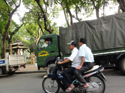 Công an dày đặc Ngay từ lúc 6:30, đã có "Cảnh sát Cơ động đầy nhóc quanh vườn hoa, xe tải mui bạt kín cũng rất nhiều," theo miêu tả của Ba Sàm. Đến 7 giờ sáng, "từ trụ sở Công an Quận Ba Đình chạy dọc Điện biên phủ, công an nổi, chìm kín đặc," Ba Sàm viết. Nhà nghiên cứu Đinh Kim Phúc nói qua điện thoại với Ba Sam, cho biết tình hình "rất căng," và "cơ quan chức năng" tung hết lực lượng và cá nhân ông Đinh Kim Phúc được “chăm sóc” từng bước.