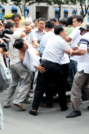 SÀI GÒN (TH) - Một tuần sau cuộc biểu tình ôn hòa chống Trung Quốc diễn ra suôn sẻ tại Sài Gòn, một cuộc biểu tình thứ nhì diễn ra hôm 12 tháng 6 nhưng bị công an ngăn chặn, phân tách, và nhiều người bị bắt, đánh dấu sự không đồng ý của chính quyền khi thanh niên sinh viên tự phát xuống đường. Một người trong đoàn biểu tình bị an ninh trong thường phục dùng võ đánh vật và mang đi. Bức hình được chuyển trên Internet, không rõ người chụp. (Hình: Facebook) Cuộc biểu tình lần thứ nhì thu hút được rất đông thanh niên tham gia. Một vài nguồn ước lượng là “khoảng bằng tuần trước,” nhưng nhiều nguồn khác đánh giá “ít hơn hẳn tuần trước”. Lần biểu tình ngày 12 không được kêu gọi mạnh mẽ bằng lần ngày 5. Trước lần biểu tình ngày 5, những lời kêu gọi được công bố trên nhiều trang blog, nhiều trang web, nhiều trang Facebook của những người nổi tiếng, trong đó có nhà báo, nhà văn, nhà thơ. Qua đến tuần thứ nhì, mức độ kêu gọi giảm hẳn. Một phần mức kêu gọi không cao bằng tuần trước, được cho là vì nhiều người bị cảnh cáo cấm biểu tình. Bắt người Ngay từ lúc đoàn biểu tình còn đang từ từ tụ tập, không khí đã căng thẳng. Mọi ngã tư dẫn đến trung tâm đều có những hàng rào barrier sẵn sàng, trang Dân Làm Báo cho biết. Giờ tập hợp được giao hẹn là 8 giờ sáng, thì lúc 8:05, một thanh niên bị một toán công an chìm, nổi rượt đuổi vào tới cà phê Highland Coffee đối diện Diamond Plaza, bắt giữ mang đi. Người thanh niên này được nhiều nguồn tin cho biết là anh Mạc Quảng Thịnh, con trai nhà thơ nhạc sĩ Ðynh Trầm Ca (tác giả của “Ru con tình cũ,” “Trăng hờn tủi,” ...). Biểu ngữ “Ngưng xâm lấn rồi nói dối” trong cuộc biểu tình tại Sài Gòn hôm Chủ Nhật. (Hình: Facebook) Một nhà báo viết trên Facebook, miêu tả cảnh rượt đuổi bắt một thanh niên, được cho là Mạc Quảng Thịnh: “8 giờ hơn, đang đếm bước trên lề đường Phạm Ngọc Thạch thì có bước chân chạy rầm rập. Mình nép vào tường, một thanh niên cầm tấm biểu ngữ chỉ kịp đọc thoáng chữ China stop... chạy trước, dăm sáu anh lực lưỡng mặc thường phục đằng đằng sát khí bám sát.” Trong một vụ khác, một thanh niên khác cũng bị bắt đi lúc đang chuẩn bị giăng biểu ngữ. Vụ này được một nhân chứng miêu tả trên Facebook: “Có một anh áo nâu bước qua đường, đi ngang đám mình đang đứng, anh ấy nói: ‘Anh chuẩn bị giăng biểu ngữ. Tụi em hỗ trợ nha.’ Rồi anh đi vào quán cà phê ở đường Alexandre de Rhodes. Mọi người đang ngơ ngác, chưa hiểu ất giáp gì thì khoảng hai phút sau một chiếc xe lớn lại hốt các xe đậu ở vỉa hè của quán cà phê, và rồi mình thấy anh áo nâu đó được hai người mặc thường phục áp giải ra xe máy, chở đi mất.” Nhóm thanh niên kiên trì nhất, ở lại biểu tình tới sau 1 giờ trưa, cũng bị đàn áp và hai người bị bắt đi. Lúc đó, nhóm này còn lại khoảng hơn 100 người. Bất ngờ, công an đưa 2 xe chuyên dụng ập đến, lao vào, và bắt đi hai thanh niên nổi bật nhất trong nhóm. Vừa bắt hai thanh niên này đi, công an vừa tố cáo họ phạm tội móc túi. “Nhiều người bất bình và phản ứng với trò vu khống lố lăng, nhưng đành bất lực trước nhóm công an đang rất thô bạo, côn đồ,” theo trang Dân Làm Báo. Một thanh niên bị an ninh chìm, nổi bu vào bắt lên xe mang đi trong ngày biểu tình chống Trung Quốc tại Sài Gòn hôm Chủ Nhật. (Hình: Facebook) Ngăn cản, đàn áp Ngoài những vụ bắt bớ lộ liễu, công an cũng ra sức ngăn cản và chia rẽ đoàn biểu tình. Nhiều nguồn tin trong nước cho báo Người Việt biết nỗ lực này được sự giúp sức trực tiếp và công khai của nhiều nhân vật tên tuổi trong thành đoàn. Khu vực quanh tòa tổng lãnh sự bị vây kín, không tới gần được. Số công an chìm nổi được cho là đông gấp đôi, gấp ba người biểu tình. Ðoàn biểu tình tuần hành bị rất đông công an, an ninh thường phục đi lẫn vào và lấn át, cũng như tách rời đoàn thành nhiều mảng nhỏ. Nhiều nhân vật tên tuổi từng tham gia cuộc biểu tình hôm 5 tháng 6 đã không có mặt trong ngày 12. Nhiều người trong số họ bị nhắc nhở và cảnh cáo đừng tham dự. Nhạc sĩ Tuấn Khanh, nổi bật trong cuộc biểu tình bảo vệ Trường Sa-Hoàng Sa năm 2007, bị ngăn chặn không được tham gia tuần đầu, qua tới tuần thứ nhì tiếp tục bị bao vây tứ phía. Ngay cả nhiều người biểu tình lần trước, cho đến thời điểm này vẫn chưa biết cuộc biểu tình đang diễn ra như thế nào. Thậm chí có người cả tuần nay không dám bước ra đường vì bị đe dọa, mạng Internet thì bị cắt, khi gọi điện hỏi thăm, họ rất ngạc nhiên vì tin có biểu tình ngày hôm nay. Trường hợp như nhà văn Ðào Hiếu, ông không hề hay biết có biểu tình. Mọi hoạt động của đoàn biểu tình đều nằm trong “tầm ngắm” của nhà cầm quyền. Với sức mạnh bị phân tán, đoàn biểu tình vừa đi vừa phất cờ, giươ