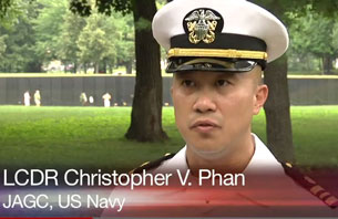 Đặng Bảo Minh là hạ sĩ nhất chuyên viên vũ khítrên hàng không mẫu hạm USS Abraham Lincoln 72. Photo fr Jimmy Dang Sau này ra đi làm việc cũng vậy, nhiều công việc đoì hỏi phải có ý chí mạnh thì mới ở lâu được chứ không thì vô quân đội vài năm là một số người đã chán và muốn xin ra thôi. Cũng như mọi binh sĩ khác, trung tá Thọ cũng phải ra chiến trường Iraq và Afghanistan. Trước đó bốn năm ông sang Iraq trong nhiệm vụ chỉ huy yểm trợ. Ông cũng chỉ mới quay lại Mỹ từ chiến trường Aghanistan hôm 6 tháng Sáu mà thôi. Thiếu tá Nguyen Trung chup ở Kabul Afghanistan. Photo fr Nguyen Trung Trong khi đó, từ căn cứ ở Orlando, Florida, thiếu tá Nguyễn Trung, qua Mỹ năm 1985, tốt nghiệp đại học Arkansas và gia nhập hải quân Mỹ, tính ra đã mười một năm. Tháng Ba 2010, thiếu tá Nguyễn Trung sang Kabul, Afghanistan, trở về Mỹ tháng Ba 2011: Thiếu tá hải quân Phan Vĩnh Chinh, cũng là một luật sư ở hiện tại ở Virginia: Đầu tiên thì em muốn làm bác sĩ, nhưng khi vô trường Y Khoa em thấy không thích thú, vì vậy em trở thành luật sư cho hải quân. Từ 2001 đến 2008 em làm việc trong quân đội, đi từ Nhật qua Iraq với người nhái. Được bạn bè gọi là Chris Phan, thiếu tá hải quân Phan Vĩnh Chinh là người chủ trương trang web của các quân nhân Mỹ gốc Việt mà có thể truy cập trên mạng. Dựa vào công việc này, qua những trao đổi với đồng đội, thiếu tá Chris Phan ước lượng có khoảng ba ngàn binh sĩ Mỹ gốc Việt trong quân đội Hoa Kỳ :