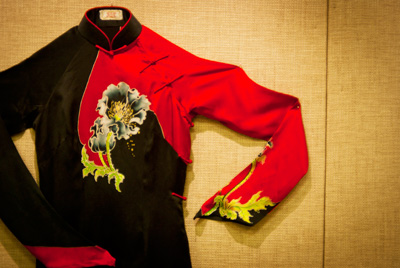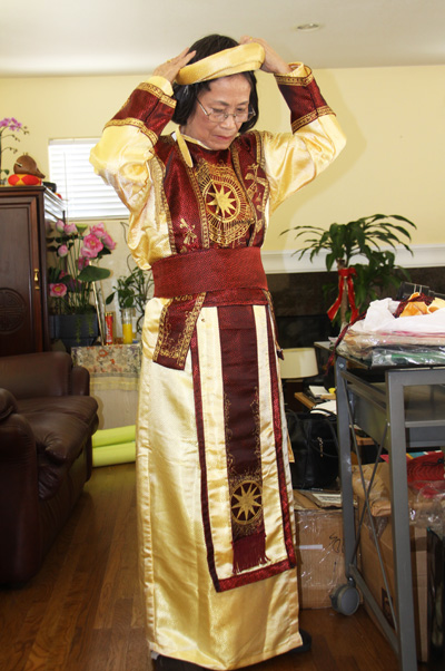 Trên nền lụa trắng, nhà vẽ kiểu Trần Thị Lai Hồng đã nhuộm màu trắng đỏ và vẽ hoa cho một mẫu thiết kế của mình. (Hình: Khoa Vũ/Người Việt) NV: Vậy, bà làm đẹp chiếc áo dài bằng cách nào? Vẽ hay may, hay thiết kế? Nhà vẽ kiểu Trần Thị Lai Hồng: Ðầu tiên là tôi thích vẽ, dù tôi chưa qua trường lớp nào về hội họa, chỉ thích là làm thôi, mày mò làm. Lúc còn ở Việt Nam, tôi chưa hề biết chuyện vẽ và nhuộm tơ tằm đâu. Tôi thấy những chiếc áo nội hóa cần phải có cái gì đặc biệt, bởi tánh tôi thích làm cái gì cho khác đi, không muốn giống người ta. Trên những chiếc áo nội hóa của tôi đã dệt sẵn những hình cúc trúc lan mai... Tôi nghĩ ra trò dùng sơn dầu pha loãng ra rồi tô lên những hình đã in sẵn đó, cho nó đẹp lên và không giống với ai hết. Khi đó là khoảng những năm 50-55. Nhiều người lấy làm lạ là sao tôi lại có những chiếc áo không giống người ta. Rồi sau đó tôi cũng có vẽ cho bạn bè. Ðến khi sang Mỹ, tôi có người em trai làm kỹ sư hóa học, em tôi khuyến khích tôi tiếp tục vẽ. Cậu ta chỉ tôi mua màu và làm cho tôi những chiếc khung căng lụa lên để vẽ. Rồi tôi đi học nghề cách nhuộm, dùng màu vẽ, cách chặn màu như thế nào. NV: Và bà đã bắt đầu công việc của một nhà thiết kế, vẽ kiểu chuyên nghiệp từ đó? Nhà vẽ kiểu Trần Thị Lai Hồng: Lúc đầu tôi cũng chỉ làm chơi, vẽ cho bạn bè, chị em trong nhà. Nhưng em trai tôi đề nghị những thiết kế đó cần được tung ra ngoài. Và cậu ta đóng cho tôi chiếc khung đầu tiên để căng lụa lên khi vẽ. Thế là tôi bắt đầu làm. Từ những thất bại ban đầu, tôi tự học hỏi thêm kinh nghiệm cho mình. Lúc đầu tôi cũng làm những cái pattern với hy vọng sẽ làm hàng loạt như người ta vẫn làm. Nhưng làm thử vài lần không được, tôi không làm khuôn mẫu được. Tức là trong tiềm thức tôi đã báo tôi phải sáng tạo từng cái từng cái một. Tôi có những cơ duyên rất lạ. Thế là từ đó đến nay, không bao giờ tôi vẽ một mẫu nào hai lần. Tôi vẫn luôn nói với khách tại sao phải mặc giống người ta? NV: Từ khi nào thì bà lại có ý nghĩ đi vào nghiên cứu trang phục phụ nữ qua các thời kỳ? Nhà vẽ kiểu Trần Thị Lai Hồng: Show trình diễn đầu tiên của tôi là năm 1992, năm đó tôi có ba show một lượt. Lúc đó trong đầu tôi chỉ có suy nghĩ là làm đẹp những bộ y phục phụ nữ. Thành ra những bộ y phục của tôi đều có đề tài, dựa trên thi ca, như “Hoa đào năm ngoái,” “Thu màu quan san”... Tánh tôi lại luôn muốn mỗi ngày mình phải mỗi khác chứ không đứng một chỗ. Tôi nghĩ phải làm cái chi khác hơn, đặc biệt hơn. Tôi lại là người thích môn sử địa nên tôi mới nảy ra ý nghĩ y phục phụ nữ ngoài chuyện phải đẹp, phải bắt mắt, để nhìn, tại sao không dùng y phục phụ nữ để ôn lại phần nào lịch sử và văn hóa Việt Nam? Tôi không dám tham vọng là mình sẽ làm được nhiều, chỉ được phần nào hay phần đó, là ôn lại ít nhiều lịch sử Việt Nam. NV: Trong quá trình đi vào tìm hiểu như vậy, bà đã phát hiện ra những điều mới mẻ gì? Nhà vẽ kiểu Trần Thị Lai Hồng: Tôi muốn thực hiện những bộ y phục có từ xưa. Mà lịch sử của mình thì không có hình ảnh. Lịch sử của mình đầu tiên dựa trên sử Tàu. Hình ảnh duy nhất để lại chỉ có thể căn cứ trên các cổ vật như trên mặt trống đồng, trên các cán dao... Từ những tìm hiểu đó, tôi đi vào thiết kế bộ trang phục Mỵ Nương Công Chúa, bộ trang phục Hai Bà Trưng. Tôi để ý thấy từ xưa đến giờ, ngay cả lúc mình còn đi học, luôn có làm lễ Hai Bà Trưng, và luôn luôn nhân vật đóng Hai Bà Trưng được cho mặc quần, mang boot, và đội khăn hoàng hậu. Tôi nghĩ, khăn Hoàng Hậu Nam Phương là có từ thế kỷ 20, chứ không phải có từ thế kỷ thứ 1, trong khi Bà Trưng ở thế kỷ thứ 1, năm 40. Tôi tìm nhiều sách vở để xem và thấy mình nghĩ đúng. Vì ở thế kỷ thứ nhất, trên thế giới chưa hề phát minh ra cái quần. Khi đó đàn bà mặc váy, đàn ông mặc khố, ngay cả ông vua cũng mặc khố. Ðến thế kỷ thứ 3 thì mới có quần, phát xuất từ Iran, tức Ba Tư xưa, và chỉ có dân cỡi ngựa mới mặc quần. Ðến khi nó qua Châu Âu thì các ông vua mới mặc quần. Rồi nó tiếp tục đi ngược lại qua ngã Á Ðông, đi lên Tàu, đến thế kỷ 17 Tàu mới xuất hiện quần và đến thế kỷ 18 quần mới vào Việt Nam. Ở Mỹ, thì thế kỷ thứ 19, đàn bà mới mặc quần. Chính từ những tìm kiếm đó tôi thấy không có lý gì để cho Hai Bà Trưng mặc quần và đội khăn Nam Phương Hoàng Hậu của thế kỷ 20. Vậy là sai. Thành ra tôi design ra bộ Hai Bà Trưng mặc váy và khăn đội ở trên đầu đơn giản thôi, chứ không phải đội khăn như Hoàng Hậu Nam Phương. NV: Từ lâu nay, người dân Việt Nam đã quen thuộc với chiếc áo dài cài nút bên phải. Bà có thể cho biết căn cứ vào đâu để bà cho rằng cài nút bên trái mới là cách cài nút chính gốc của người Việ