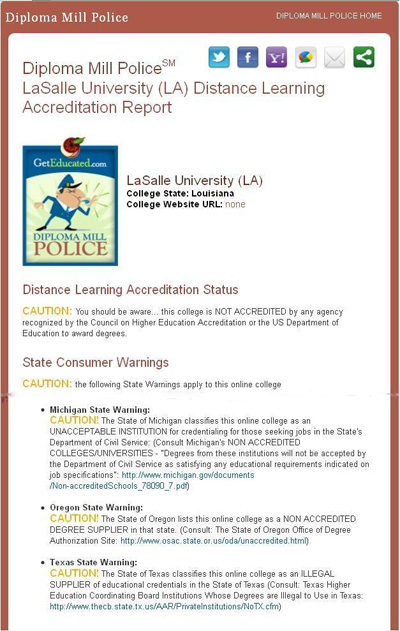 Vào giữa thập niên 1990, cái trường “LaSalle” trở thành đáng nghi ngờ khi chính phủ khám phá thấy hàng ngàn công chức đủ mọi ngành đã được thăng cấp hay thu nhận đã nộp các bằng cấp do cái trường này cấp phát. Từ đây, Bộ Tư Pháp Liên bang mở điều tra thấy ở Louisiana có cả chục trường dỏm như vậy. Chỉ riêng trường “LaSalle” đã cấp tới hơn 40,000 văn bằng các loại mà hầu hết đều cấp cho công chức chính phủ. Nhiều người nắm giữ các chức vụ khá cao, kể cả cơ quan nguyên tử năng. Theo tài liệu từ 1 tháng 7, 1997, cái trường “Lasalle” tách rời khỏi World Christian Church và trở thành công ty kinh doanh giáo dục hàm thụ “Lasalle Education Corp.” do John Scarpitti làm chủ tịch. Nhưng đến năm 2000 thì đổi chủ và trở thành Orion College nhưng chẳng bao lâu cũng đóng cửa. Ông Ngoạn nói rằng ông “bảo vệ luận án tiến sĩ vào cuối năm 1998” tức là khi cái trường này trờ thành một cơ sở thương mại, kinh doanh hàm thụ, bán bằng cấp. Một thứ bằng cấp không được công nhận (Unaccredited). Tại tiểu bang Louisiana có một số trường dỏm nhái tên một số đại học thật để kinh doanh bán bằng cấp dỏm, như “Lasalle” nhái trường La Salle, “Columbia State University” nhái tên trường đại học nổi tiếng Columbia University ở thành phố New York, và một số trường khác. Nếu ai vào trang mạng tìm kiếm Google và đánh tìm danh sách các trường dỏm (Unaccredited Schools and Educational Facilities, hoặc Unaccredited College, University) người ta sẽ thấy một danh sách dài các trường dỏm khắp nơi trong đó có tên trường LaSalle ở Mandeville và trường South Pacific University, hay Western Pacific University mà nhiều quan chức ở Việt Nam khoe tốt nghiệp tiến sĩ. Các trường dỏm được gọi là “diploma mill” thu một số tiền khá lớn của học viên, cấp phát một văn bằng mà không đòi hỏi học tập, theo các tiêu chuẩn do chính phủ đòi hỏi. Nhờ vậy mà một ông Nguyễn Ngọc Ân, giám đốc Sở Văn Hóa Thể Thao tỉnh Phú Thọ có bằng “tiến sĩ” ở “Western Pacific University” mà ông hoàn toàn “không biết tiếng Anh,” theo bài viết trên tờ SGTT.
