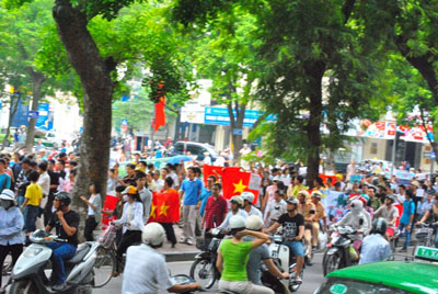 ‘Bên cạnh các biểu ngữ quen thuộc, có một số biểu ngữ ghi lời của Trung tướng Nguyễn Đức Nhanh, Giám đốc Công an Hà Nội rằng: ‘Không có chủ trương trấn áp người biểu tình yêu nước.’