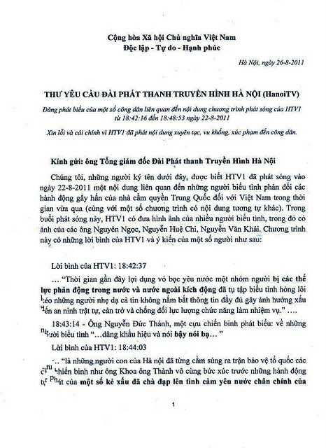 Chúng tôi, những người ký tên dưới đây, được biết HTV1 đã phát sóng vào ngày 22-8-2011 một nội dung liên quan đến những người biểu tình phản đối các hành động gây hấn của nhà cầm quyền Trung Quốc đối với Việt Nam trong thời gian vừa qua (cùng với một số chương trình có nội dung tương tự khác). Trong buổi phát sóng này, HTV1 có đưa hình ảnh của nhiều người biểu tình, trong đó có ảnh của các ông Nguyên Ngọc, Nguyễn Huệ Chi, Nguyễn Văn Khải. Chương trình này có những lời bình của HTV1 và ý kiến của một số người như sau: