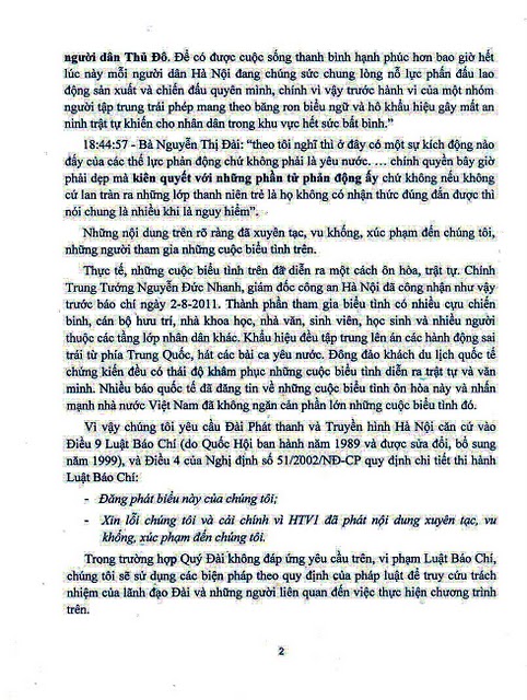 Vì vậy chúng tôi yêu cầu Đài Phát thanh và Truyền hình Hà Nội căn cứ vào Điều 9 Luật Báo Chí (do Quốc Hội ban hành năm 1989 và được sửa đổi, bổ sung năm 1999), và Điều 4 của Nghị định số 51/2002/NĐ-CP quy định chi tiết thi hành Luật Báo Chí: