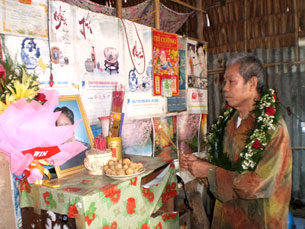 Anh Trương văn Sương thắp nhang cho người vợ đã chịu đựng đau khổ chờ chồng đến chết. RFA file
