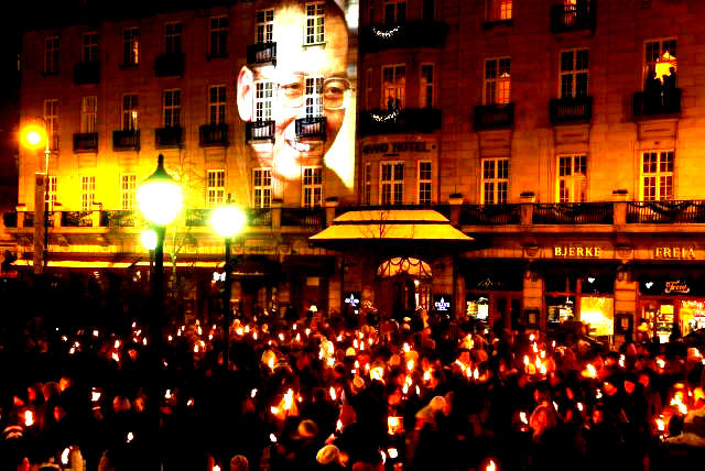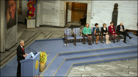 Tại lễ trao giải Nobel hòa bình hôm nay ở Oslo, chủ tịch ủy ban Nobel Na Uy, Thorbjorn Jagland, đã đọc bài diễn văn dài ca ngợi nhà đối kháng Trung Quốc Lưu Hiểu Ba.